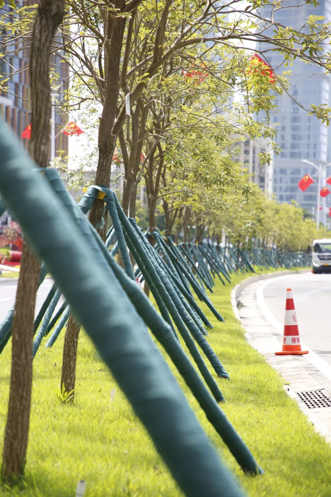 用绿布对支持杆举行二次加固和美化